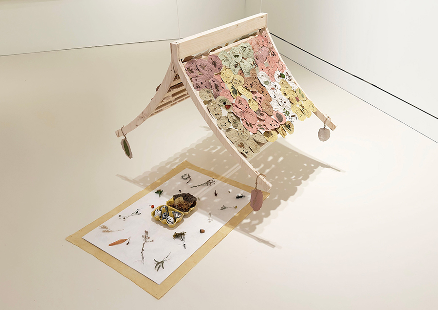 tinte, paper mâché, salt, seaweed, lacquer, wood, wire, hanji, canvas, paper, stone